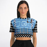 Pacific Palisades Blue Patchwork Short Sleeve Cropped Eco-Poly Sweater