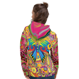 Meet the 'Painted Lady' SYLKKE hoody. Embrace your inner hippie each and every time you sport this hoody. This comfy unisex pullover has a silky soft cottony exterior decorated by a painted butterfly surrounded by vibrant shades of green, blue, coral, pink and orange. You will appreciate the double-lined hood with contrasting patterns, soft brushed fleece interior and front kangaroo pocket to keep your hands warm and keep your phone within easy reach. It's perfect for wrapping yourself into on a chilly evening. And best yet, it's exclusive to That Hoody Shop.